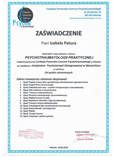 Zachęcamy do zapoznania się z certyfikatami uzyskanymi przez psychoterapeutkę Izabelę Paturę i prowadzoną przez nią Pracownię Psychterapii Arcanus. Zdobyte osiągnięcia i kwalifikacje są potwierdzone przez liczne dyplomy i zaświadczenia.